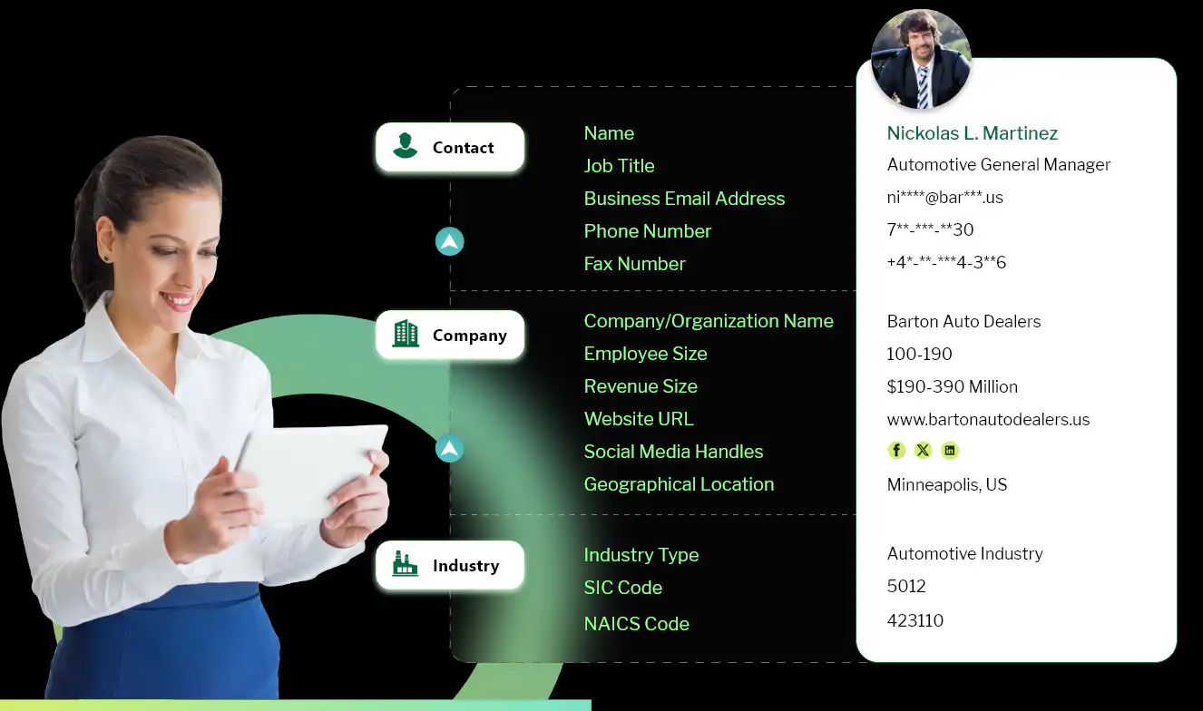 Gain access to validated contact details of decision-makers, dealership owners, service managers, and automotive executives through our automotive dealers email list. Our data is sourced from various trusted online and offline platforms, including webinars, seminars, business directories, trade show attendee lists, dealership websites, and public databases.